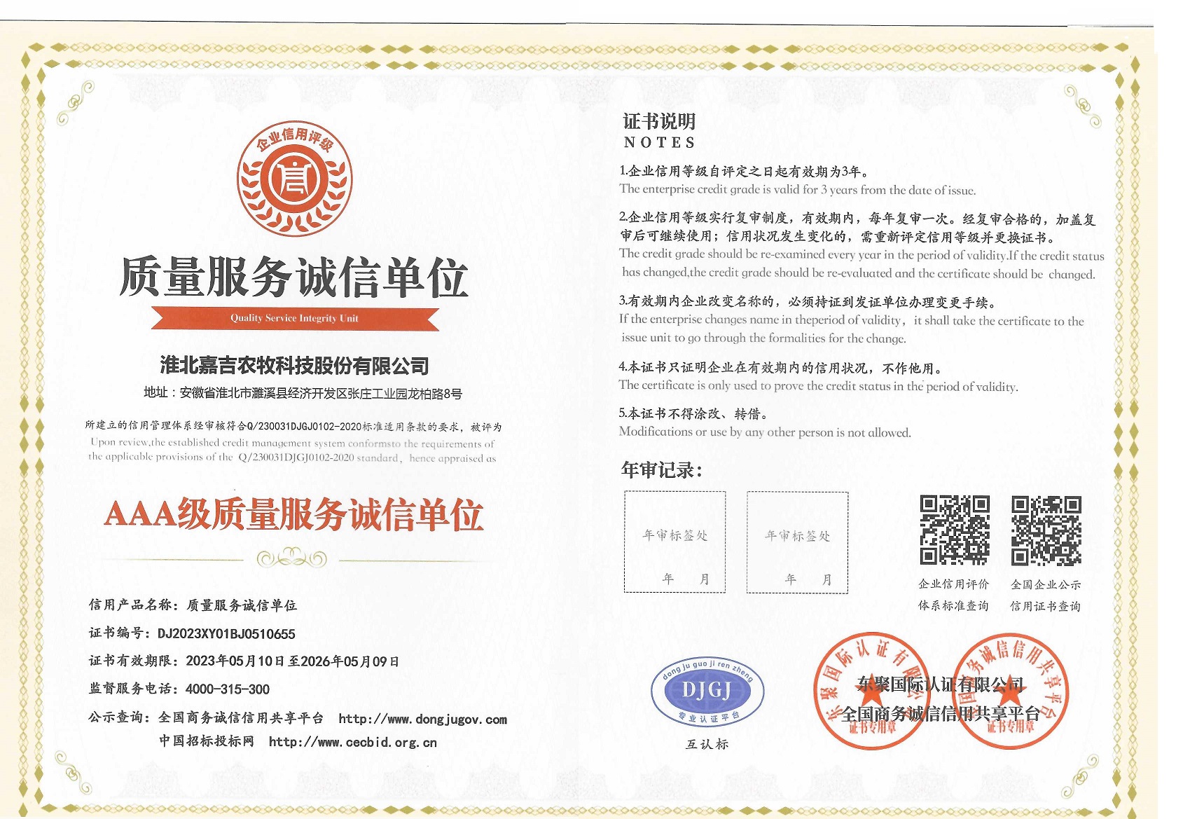 AAA級質量服務誠信單位